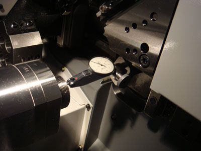 10、背面鉆孔刀架與背軸同心度: 把千分表裝在專(zhuān)用的檢具上,觸頭接觸刀架孔內(nèi)的檢棒,旋轉(zhuǎn)表頭,觀察千分表指針數(shù)據(jù). 加工影響:刀具(鉆頭)壽命,偏孔,擴(kuò)孔